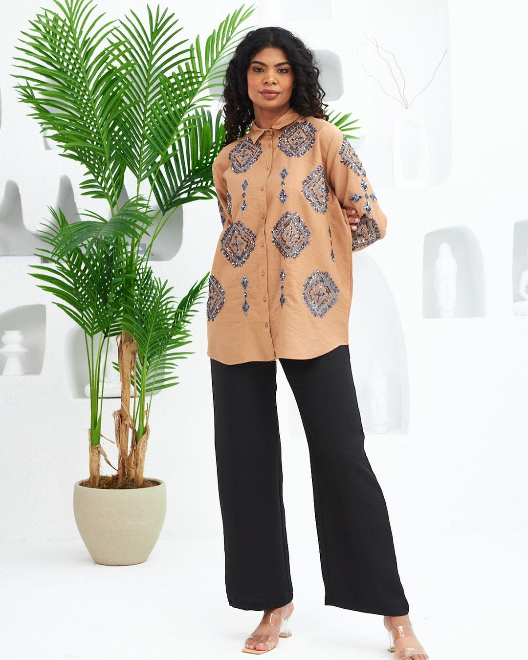 شومیز مجلسی پولکدوزی طرح لوزی فوقالعاده شیک و باوقار 😍 جلوی شومیز و آستین پولک کار شده و پشت کار ساده است 🤎 تک رنگ قهوه ای فری سایز : دور سینه ۱۱۸ دوربازو۴۲ قد۷۸/۸۰