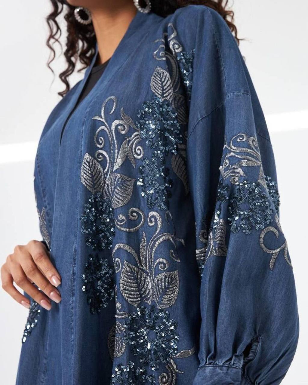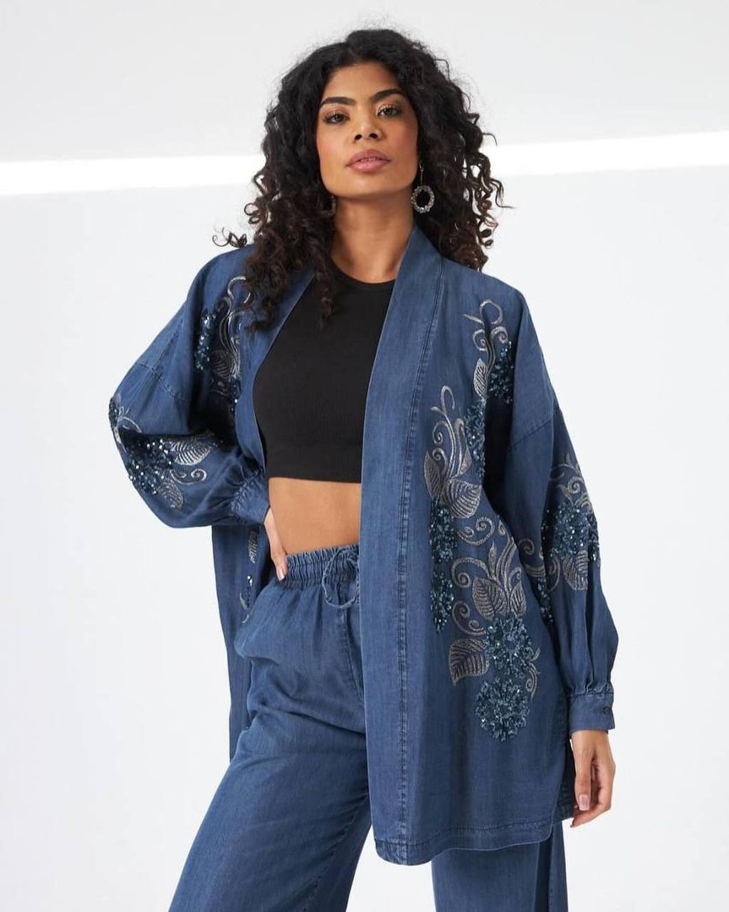 رویه جین کاغذی فوقالعاده لطیف و سبک 🤌 جلو و آستین های رویه پولکدوزی و قیطون دوزی شده😍 رنگ سرمه ای💙 فری سایز تا ۵۴ دور سینه تا ۱۴۰ قد رویه ۸۵